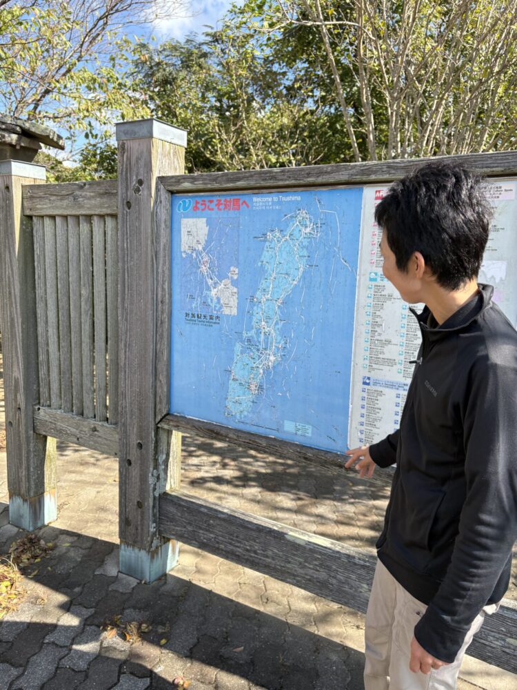 ツアー参加者は私の他4人。みんなでミニバンに乗っていよいよスタートです!まず辿り着いたのは、島のど真ん中、万関橋にある休憩所と烏帽子岳展望台。 ハゲハゲの地図を前に、島の地形の案内がスタート。