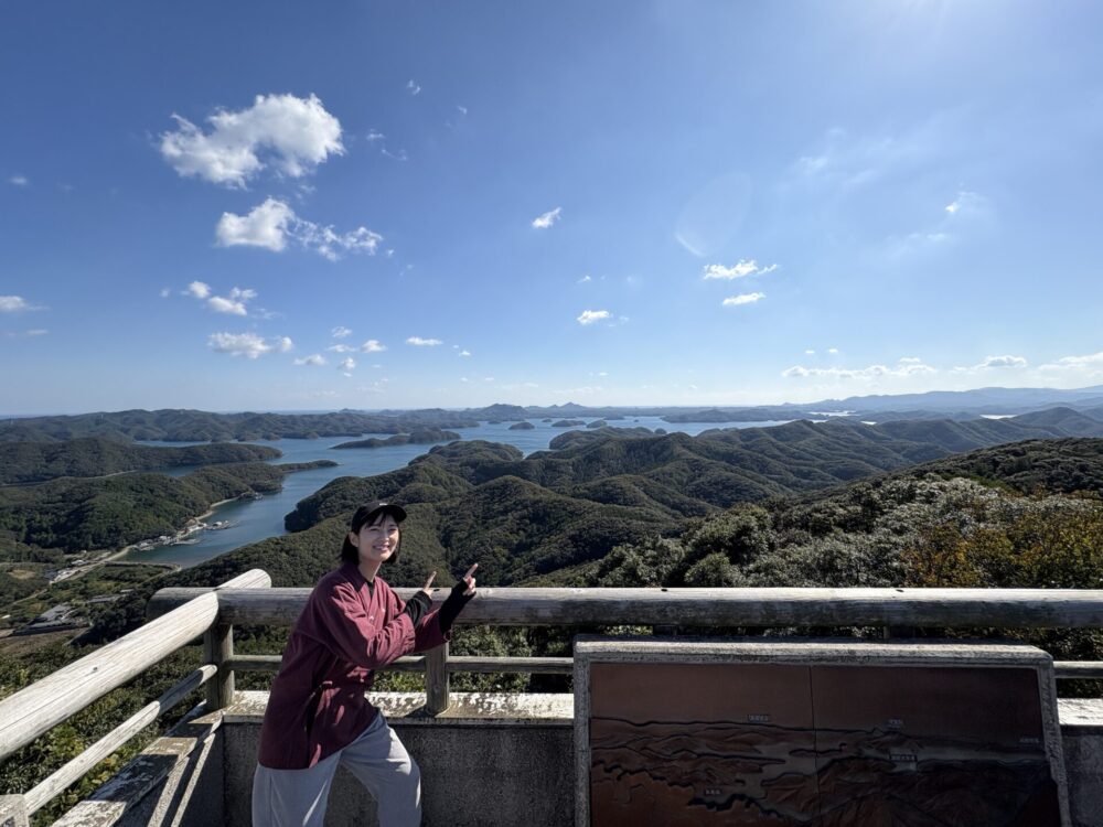 烏帽子岳展望台では超絶お天気に恵まれたことで北に釜山が見えて、南に壱岐島が見えました。ああ交流と国防の島だ・・・としみじみ実感しながら。浅茅湾が穏やかで。昔からこの浅茅湾に入ると、漁師さんも貿易船も「これで一安心」となったそう。