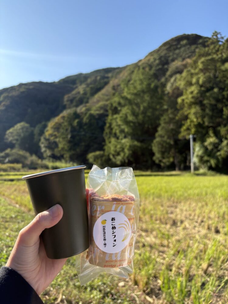 川口さん「おやつに、佐護のお米を使った米粉のシフォンと和紅茶をどうぞ」