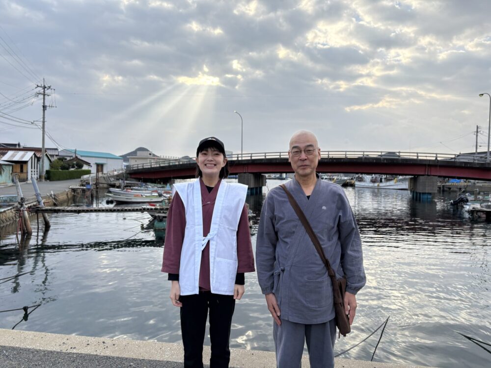 イカ漁船が浮かぶ海をバックに、大西住職と記念撮影。私がプロデュースする「みほとけ作務衣」を長年愛用してくださっていたという。奇跡の顧客様とのご対面ともなりました。嬉しい。