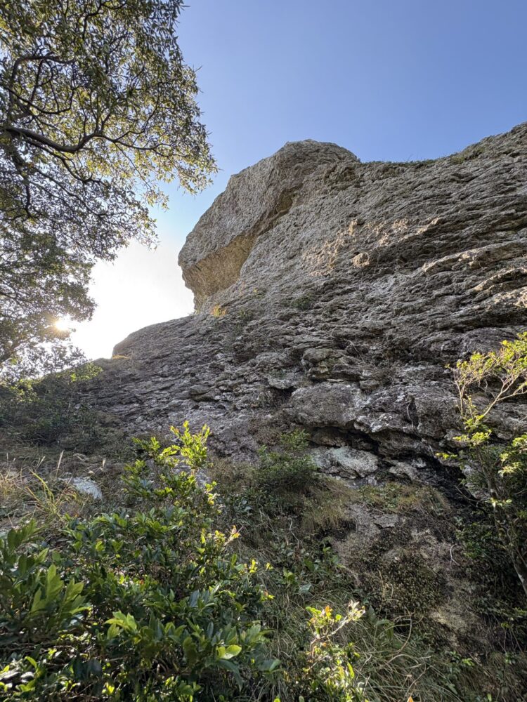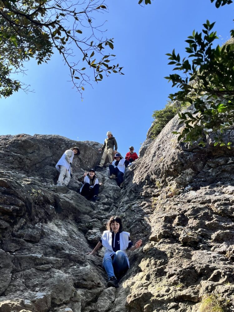 ここからは難所です。よじ登るように地面や岩壁を登って、徐々に山頂の大岩が見えてきました!これは降りるシーンですが、ウンショウンショ・・・とのぼって