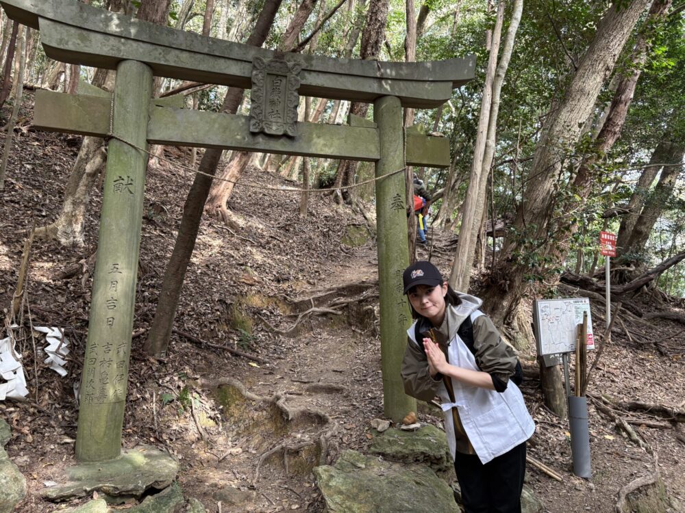 川口さんがサクサクと扇動して歩いてくださるから安心です。自然の地形、炭焼きの文化、ヤマネコの生態、など山と人の暮らしについてクイズを出題してくれながら。楽しく聞いていたらあっという間に山頂付近へ。「白嶽神社」の鳥居で深々と一礼。