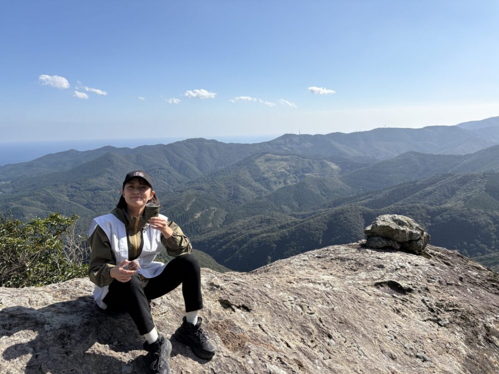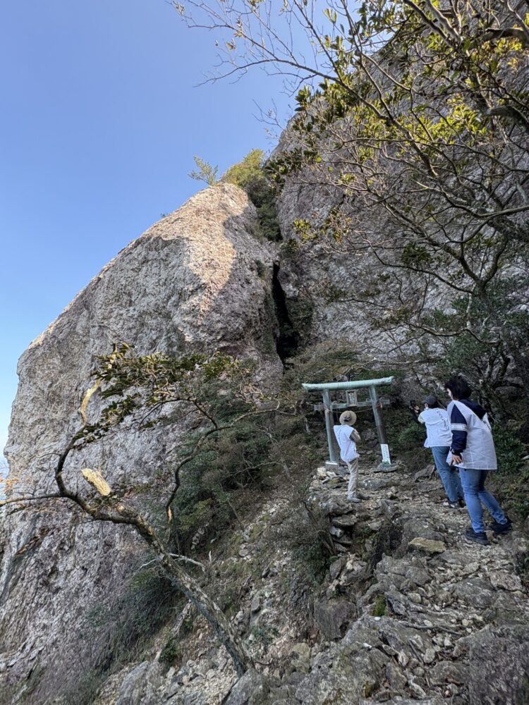登山口の麓で、「トトロの耳みたいに2つの岩が尖っているのが山頂で、雄嶽と雌嶽の神聖な場所。みなさん雄嶽には上まで登りきりますが、雌嶺には上まで登りません。なぜでしょう?」二日目もワクワクのクイズが登場します。なんだろうな〜と思いながら、車は狭い山道を進んで、徒歩の登山口に到着!