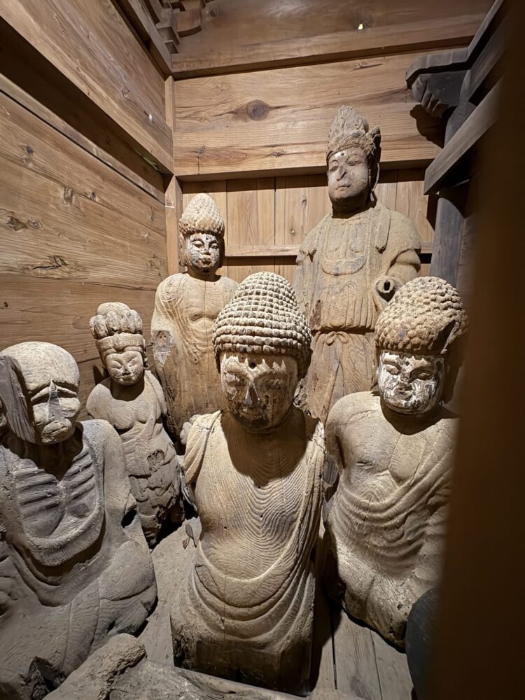 日本の仏像は、平安時代の終わり頃から、何種類かの木材をくっつけて作る寄木造りという製法で仏像が彫られますが、それより古い一本の木材から彫り出す、一木造りというやり方です。木そのものに霊性を感じるからこそできる技であります。オンボロだなぁなんて思う暇はありません。経年劣化や、廃仏毀釈で破損れたような痛々しさにも心砕かれるような思いですが、それでも失われていない仏さま然としたオーラを見逃してはいけません。このイチゴのような螺髪(髪型のこと)なんて最高じゃないですか!如来像を彫る時のハウツーを知ってはいるけど、技術がなかったのか、結果としてこんもりと可愛い髪型になってしまったのでしょう。でもお身体なんか丸く張り出すようで、立派ですよね。木が持つ力と仏様の存在感が融合したカッコ良さです。後ろの方に立っているお像は、吉祥天かしら。。。。