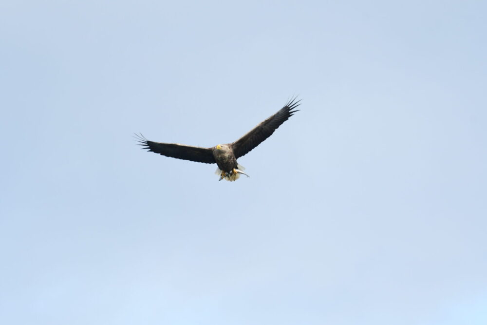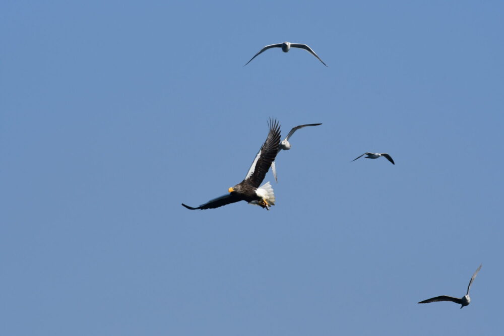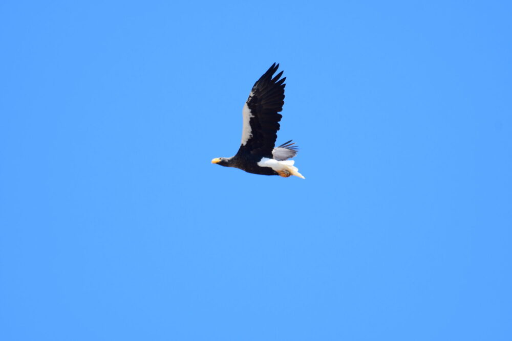 そして、冬の野鳥観察をさらに特別なものにしてくれるのが、絶滅危惧種のオオワシやオジロワシとの出会いです。日本国内で見られる最大級の猛禽類で、2メートルを超える大きな翼を広げ、海を背景に悠々と旋回する勇姿を一度目にすると、双眼鏡もカメラも離さずにいられません。オレンジ色の嘴に鋭い眼力、猛々しいシルエットに思わず見惚れてしまいます。