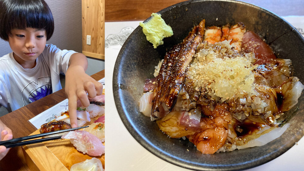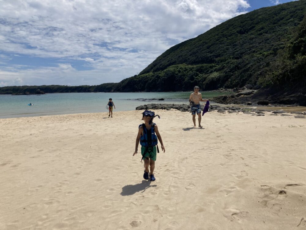 午前中は三宇⽥浜で遊ぶ→昼⾷はすし処 慎⼀でランチ→午後は⾍探し→渚の湯→⾃炊→みうだペンション泊